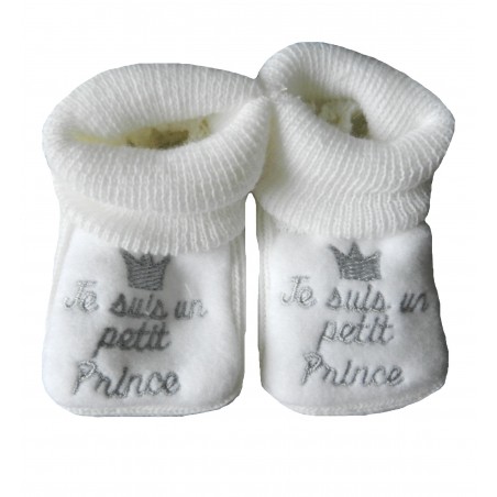 Chausson naissance blanc avec une jolie broderie argentée sur le dessus "Je suis un petit prince"!